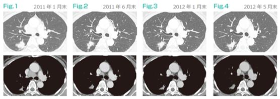 案例:60歲女性 無(wú)吸煙史 2011年1月診斷為T(mén)4N3M1a肺腺癌(肺內(nèi)及鎖骨上淋巴結(jié)轉(zhuǎn)移)。2011年3月初開(kāi)始CDDP+PEM+BV化療,并切除了右鎖骨上淋巴結(jié),將切除淋巴結(jié)溶解制作DC疫苗,以待后用。至6月,CDDP+PEM+BV治療4次,細(xì)胞療法3次,發(fā)現(xiàn)腫瘤縮小(PR),隨機(jī)停止聯(lián)合化療,7月開(kāi)始維持治療僅使用貝伐+細(xì)胞療法,觀察至2015年5月底腫瘤未進(jìn)展。