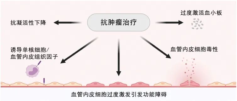 其中,化療和分子靶向藥物等藥物治療會通過降低抗凝活性,誘發單核細胞和血管內皮細胞的組織因子,過度激活血管內皮細胞而發生功能障礙,產生血管內皮細胞毒性,引起血小板過度激活等方式促進血栓形成(如圖)。
