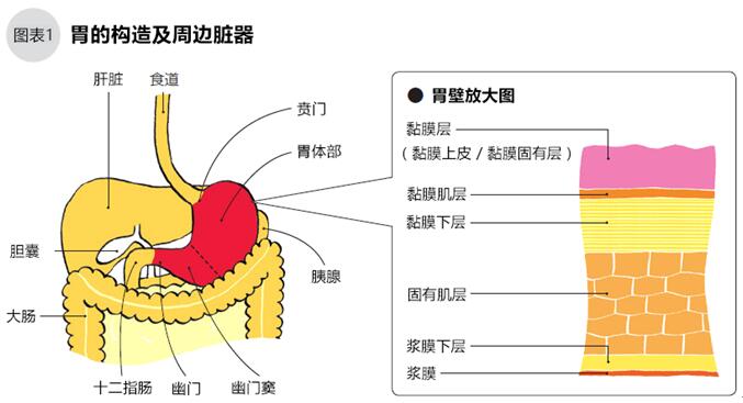 胃是呈口袋狀的器官,位于胸骨劍突下偏左的位置,周圍有肝臟、脾臟、膽囊和大腸等。食物從食道進入胃的入口處叫賁門(讀作ben,經常被誤讀為噴門)、連接十二指腸的出口處叫幽門,從賁門往幽門方向到胃2/3處的部分稱胃體,從幽門往賁門方向到1/3處的部分稱幽門竇(圖1)。胃壁為6層結構,最內側為黏膜層,之下依次為黏膜肌層、黏膜下層、固有肌層、漿膜下層、漿膜(圖1)。