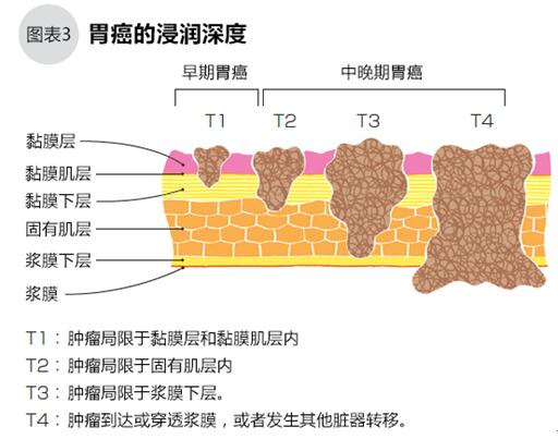判斷分期時,需先評估腫瘤對胃壁的浸潤程度(用T表示浸潤深度),判斷是早期胃癌還是中晚期胃癌(圖3)。但T評估不能完全說明腫瘤的進展情況。早期胃癌的癌細胞局限于黏膜層和黏膜肌層內,發生轉移的可能性非常低,通過手術切除治愈的可能性非常高;中晚期胃癌的癌細胞已經抵達或穿透固有肌層,此時發生淋巴轉移或其他臟器轉移的可能性就非常高。確定早期或中晚期后,再確認是否已經發生淋巴結轉移(用N表示轉移程度)和其他臟器轉移的情況,最后綜合以上因素確定胃癌的分期(表4)。