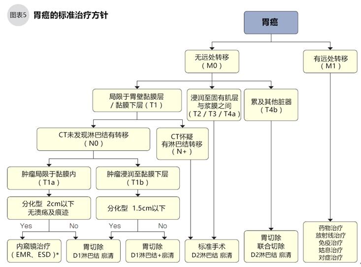 日本胃癌學會編纂的《胃癌治療指南Guide Line》把有無遠處轉移用M0和M1表示,浸潤深度用T1a~T4b表示,有無淋巴結轉移用N0和N+表示,確定分期后再根據癌細胞的類型(分化型,未分化型)、腫瘤的大小,采用不同的標準治療。