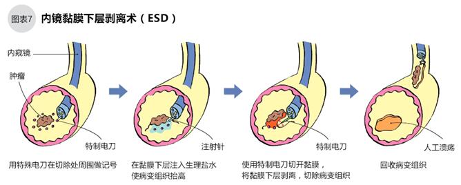 目前內窺鏡治療主要使用的是內鏡黏膜下層剝離術(ESD)(圖7),ESD術后必須對切除的腫瘤進行病理診斷,如果能評估腫瘤完全切除且無淋巴轉移的,治療就此完成。但是考慮胃癌術后有局部復發的風險,術后仍須每年進行1~2次的胃鏡檢查。另外,必要時可追加腹部CT、超聲波檢查。如果幽門螺旋桿菌檢查為陽性,需要接受除菌治療,隨訪觀察。