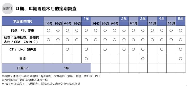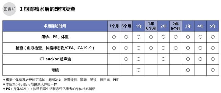 《胃癌的治療指南》規定了Ⅰ期、以及手術可能治愈的Ⅱ期、Ⅲ期胃癌在手術治療后的定期復查時間,請參照圖表12、13。