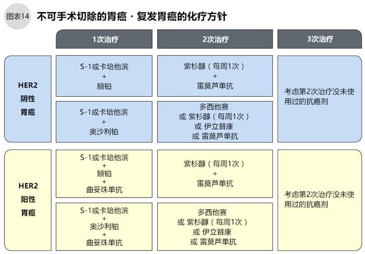 對于沒有機會手術或復發的胃癌,以藥物治療為主。根據免疫組化HER2的結果(陰性或陽性),治療指南準備了第1次、第2次、第3次藥物治療方案(亦稱一線、二線、三線方案),同時配合免疫治療、姑息治療可能增加藥物治療的效果,緩解副作用的癥狀。