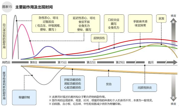 副作用的出現方式(癥狀、時期、時間段、頻度、程度等)因抗癌劑的種類和個體差異有所不同(圖15)。傳統細胞毒性抗癌劑通過抑制癌細胞的增殖以期望達到抗癌效果,但是其容易傷害分裂活躍的毛根細胞、骨髓細胞、胃黏膜細胞、生殖細胞等,因此上述部位容易出現副作用。一般情況下,治療胃癌的抗癌劑容易引起的副作用主要有消化道癥狀(食欲不振、惡心、嘔吐、腹瀉等)、骨髓抑制(白細胞減少、血小板減少、貧血等)、口腔炎癥、脫發、疲倦感等。不同的藥物有不同的副作用,比如S-1或卡培他濱容易出現流淚、手足綜合征、皮膚色素沉著的癥狀;紫杉醇和多西他賽容易出現過敏性癥狀。