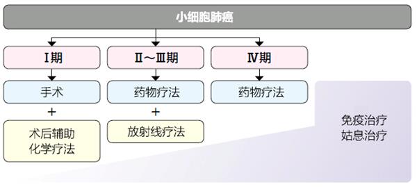 Ⅱ期以后的小細胞肺癌治療以化學療法為主,ⅡA-ⅢB期(未發生對側肺門淋巴結轉移、無大量胸水)只有局部病灶的行抗癌劑+放射線聯合治療;ⅢB~Ⅳ期的行抗癌劑化療。抗癌劑的組合可以用“PE療法=順鉑+依托泊苷”與“CAV療法=環磷酰胺+多柔比星+長春新堿”交替;在日本,標準治療首選“PI療法=順鉑+伊立替康“。如遇高齡患者,PS2(狀態評價)以上的首選”卡鉑+依托泊苷“療法。這些化療都以3~4周為一個療程,連續進行4~6個療程的治療。
