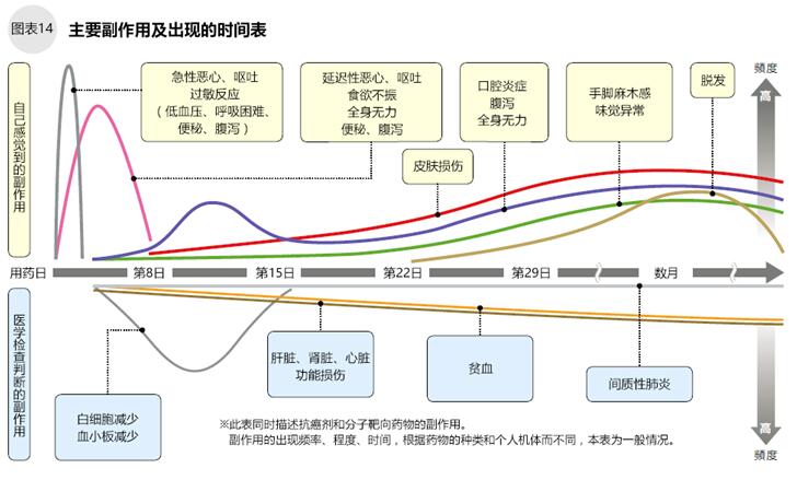 藥物治療的副作用因人而異,有的患者在使用抗癌劑的當天就開始出現過敏反應,脫發、惡心嘔吐、食欲不振、腹瀉、口腔炎癥、白血球、血小板減少等癥狀。化療之前和化療同時使用一些減緩副作用的藥物可能減輕癥狀,如果副作用過于強烈,就需要減少抗癌劑用量或者中止化療。要在更好的狀態下延長生存期,按計劃完成化療很重要,但是沒必要忍受強烈的副作用,請與醫師及護士隨時溝通,必要時進行姑息治療。