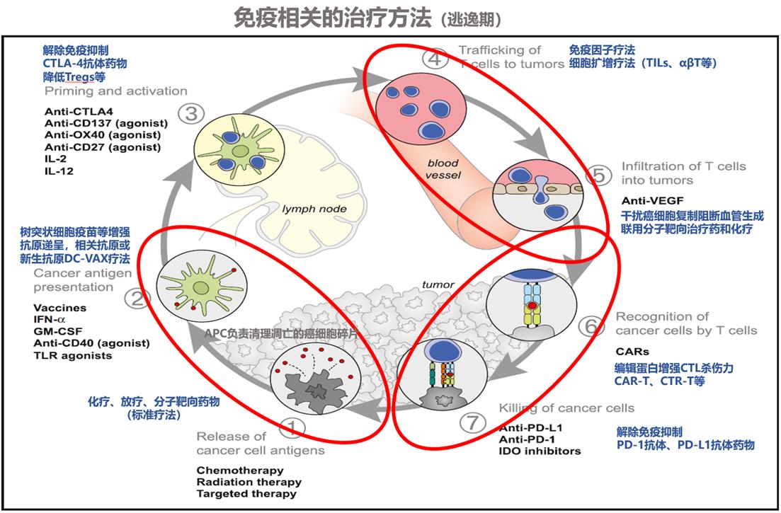 因此,“癌癥免疫學編輯理論”的概念被廣泛接受。癌癥的免疫編輯指癌細胞在生存演化過程中設計了從免疫監視中逃逸的機制,這一概念進一步發展了“免疫監視理論”,我們將免疫監視和免疫編輯融合,理解了“惡性腫瘤的免疫循環”(圖1),相應的免疫療法也應運而生(圖2),并將癌癥與免疫的關系分成了三個階段。“清除期”、“平衡期“、“逃逸期”。