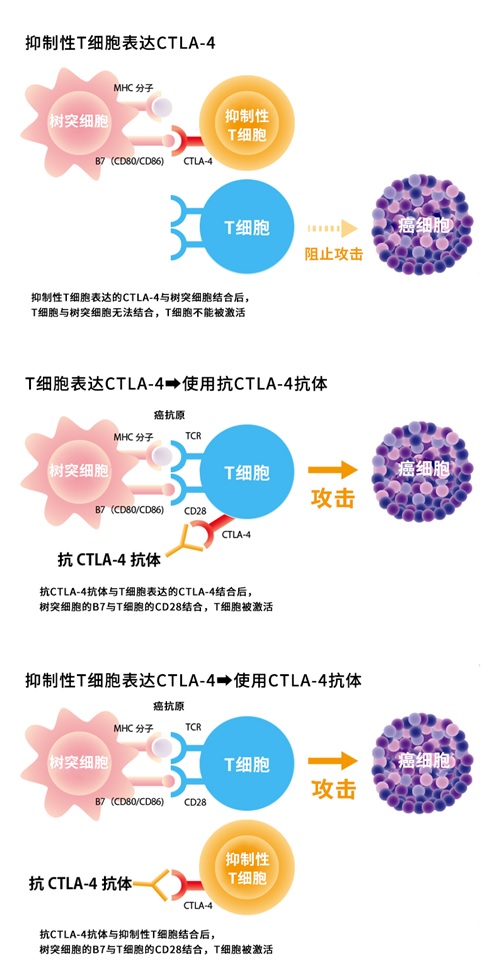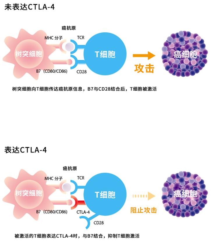 PD-1和CTLA-4均充當著通過免疫檢查點分子抑制免疫活性的角色,他們抑制免疫清除癌細胞,但作用機制不同。