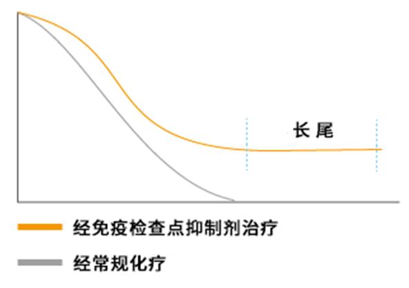 統計化療藥物的作用時,通常使用Kaplan-Meier曲線來分析患者的生存狀況。曲線顯示了隨時間變化,患者生存情況,細胞毒性抗癌藥物的生存虛線隨時間推移呈下降趨勢,有明確的終點。經ICI治療后曲線下降到中間位置后,呈水平直線延申而不再下降(圖5)。這種現象稱為“tail plateau”(長尾),表明對ICI有反應的患者獲得了長期生存。