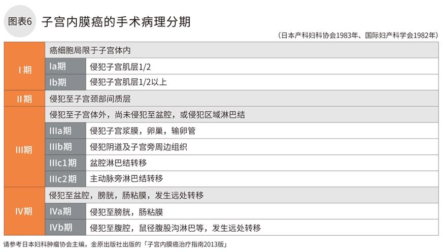為了制定治療方針,評估癌細胞的浸潤范圍的判斷標準即為分期。日本婦產科學會制定了《臨床分期》(圖5)和《術后病理分期》(圖6)2種分類的標準。該標準基于2008年改版的國際婦產科聯合會(FIGO)的分類標準,并于2011年再次改版而成。