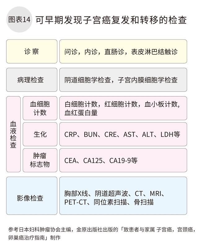 手術,放療后可通過影像檢查,腫瘤標志物測定來判斷癌細胞是否消失,或者變少。但是即使肉眼或檢查數據顯示癌細胞消失,手術切除的子宮,卵巢,輸卵管附近臟器或腹腔,以及離原發部分較遠臟器還是可能會出現復發或轉移。通常復發發生在2年內,5年以后也可能會發生。所以至少5年中需要定期隨訪。前三年每1~3個月,第四~五年每6個月,六年以后1年1次。隨訪期間,需進行問診,內診,直腸檢查,陰道細胞學檢查,影像檢查,血液檢查等。(圖表14)。這些檢查與確診子宮癌時的檢查相同。