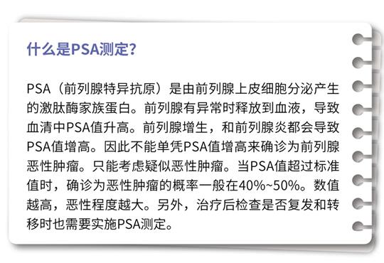 其中最便捷的篩查方式是PSA測定。雖然不能單憑此確診是否為惡性腫瘤,但可用來確認是否有患病的可能性,是初步篩查中最適當的檢查方式。通過血液檢查即可測定,即使沒有任何自覺癥狀,可作為健康體檢的一個項目。事實上,由于PSA測定的普及,前列腺癌的早期發現率已經有很大提高。
