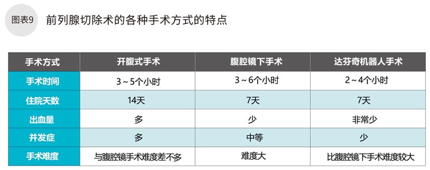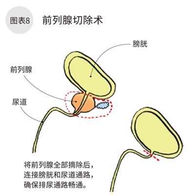 在日本應用廣泛的3種切除方式包括,恥骨后前列腺切除術,經會陰前列腺切除術,以及腹腔鏡下前列腺切除術。恥骨后和經會陰兩種是開腹式手術。恥骨后式,是從肚臍下方切開皮膚,從腹部向前列腺實施。經會陰式,是從肛門周圍U型切開,經會陰處摘出前列腺。腹腔鏡下手術,是近年來快速普及的一種方法,在腹部開5~6個孔,通過嵌入內視鏡和手術鉗進行手術。