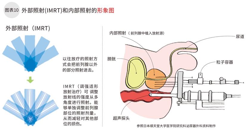 內部照射,是將放射性粒子放入前列腺中,從體內持續發出射線的方法。前列腺組織增大時需要輔助超聲探頭,結合影像向會陰部植入穿刺針,通過穿刺針將粒子容器埋入前列腺中。放射性粒子中密封了低放射物質。副作用與外部照射相同,但相對于外部照射,治療時間短,傷害程度小。粒子為永久性植入,放射量逐漸降低,約1年后射線消失,無長期影響。